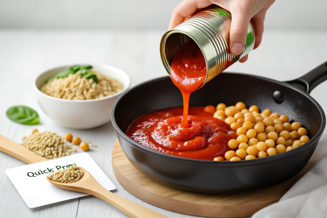 On those nights when you roll in late and your brain’s fried, quick canned meals are your best friend, like actually. You might warm canned lentils with jarred salsa and spoon it over rice, stir canned tomatoes and olives into pasta, or simmer canned chickpeas in coconut milk with curry powder for a super fast comfort bowl. Keep a mental list of 3 or 4 combos you love so you can just go on autopilot – no recipe, no stress, just real food that fills you up fast.